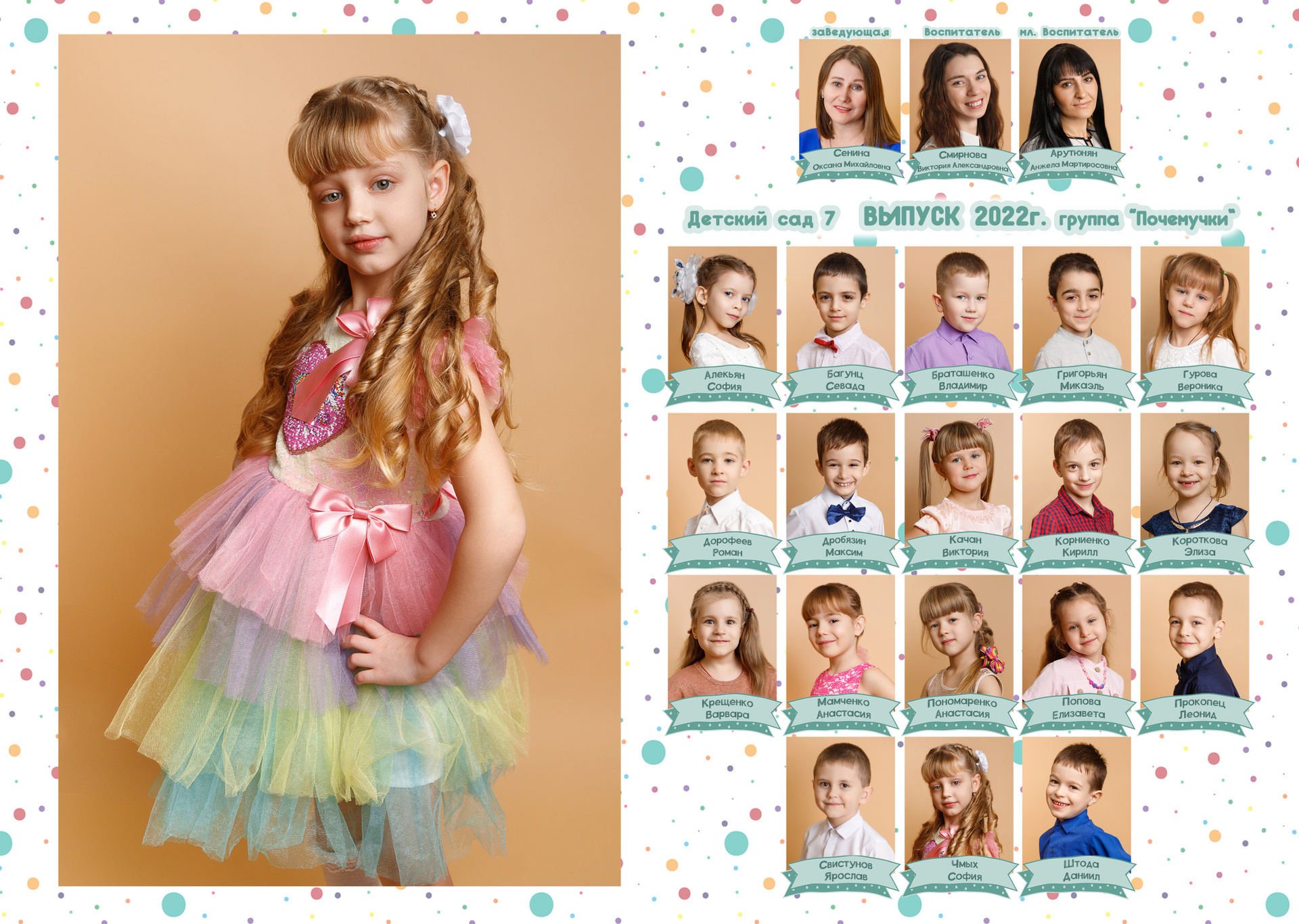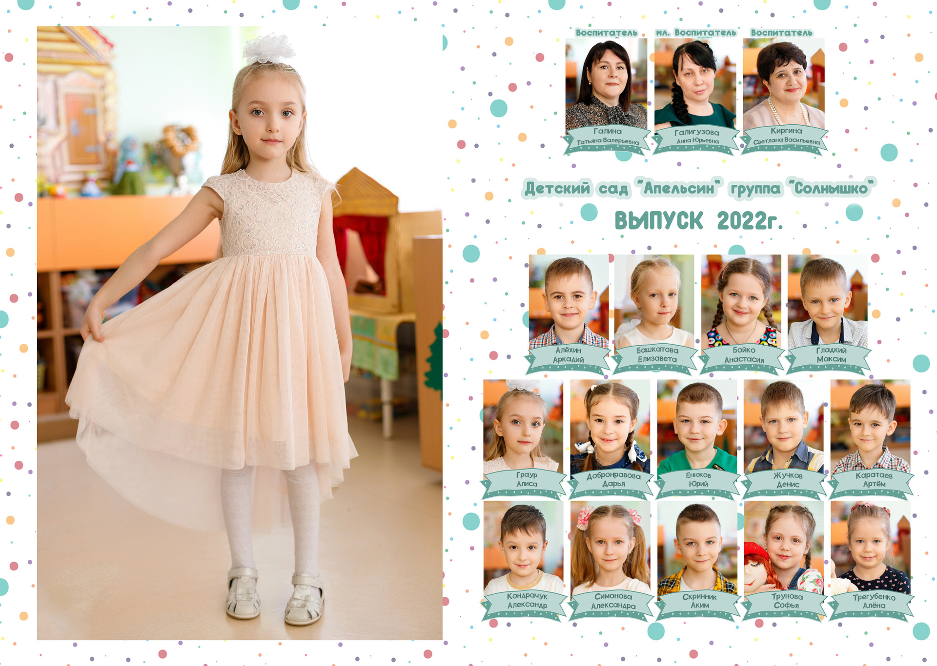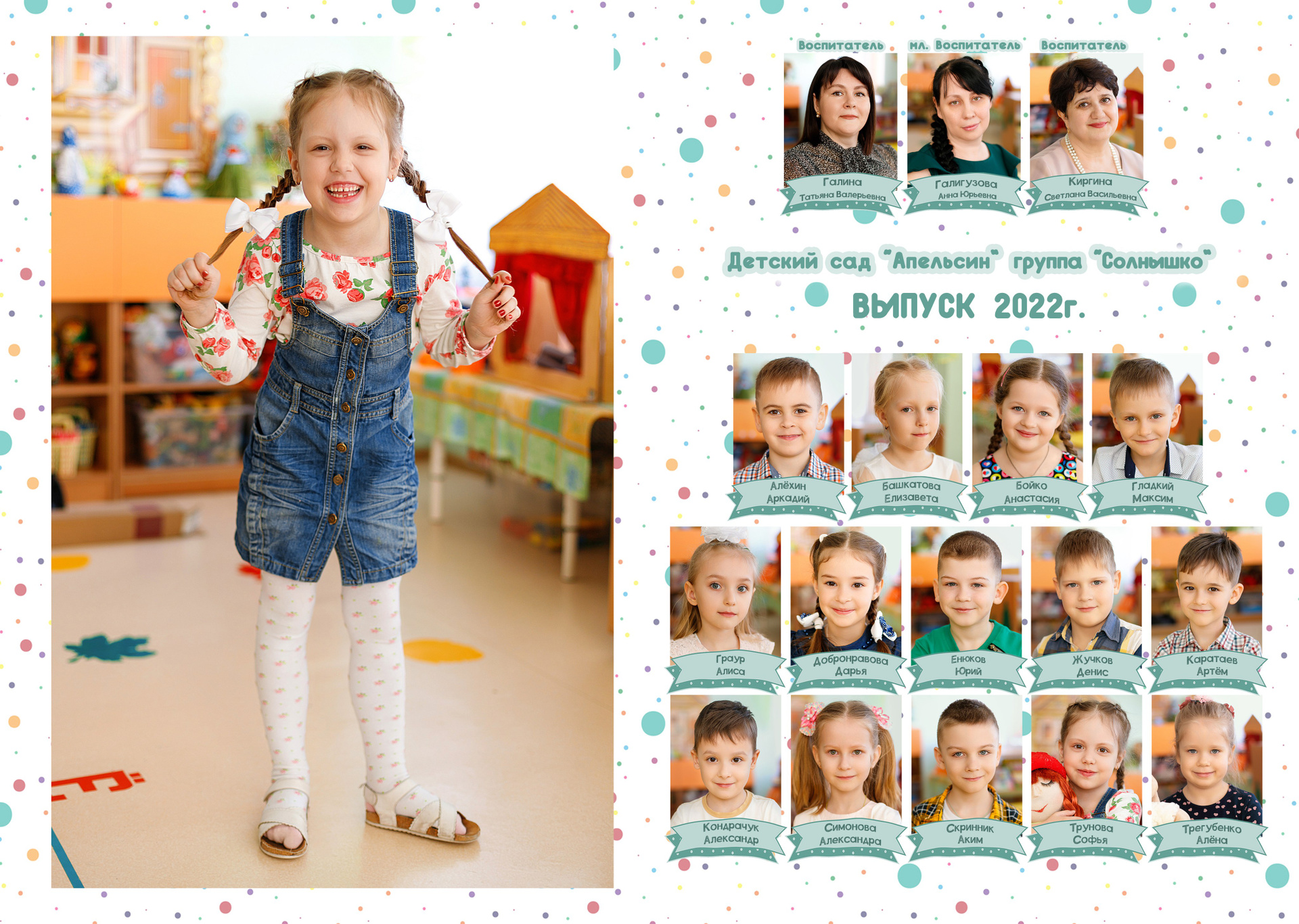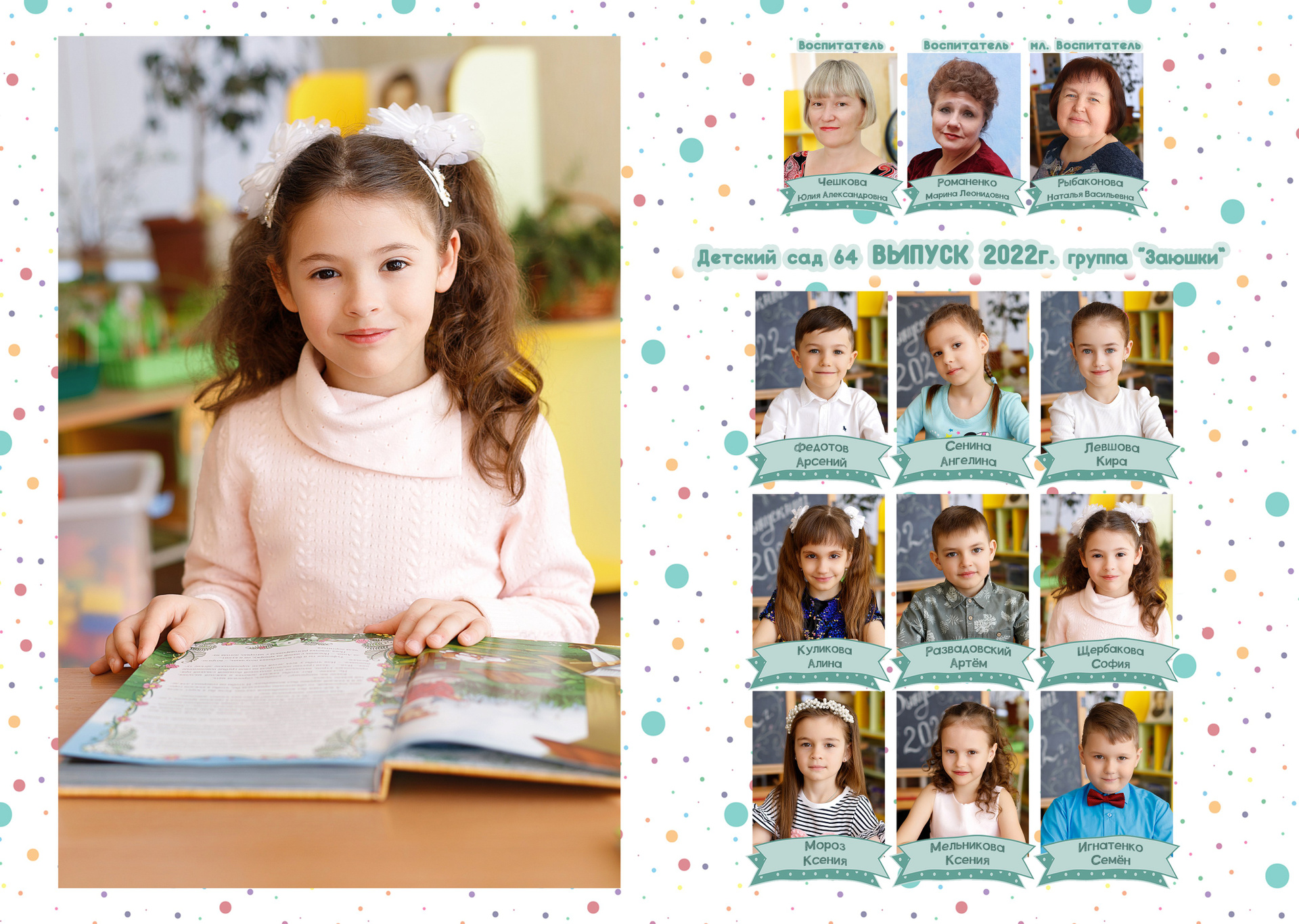 1 стр. — портрет№ 2. Можно в полный рост. Зависит от контекста съемки. В данном варианте портреты сняты в саду. Группа была маленькая, поэтому выбран объем «ЛАЙТ», где на первом развороте на 2 стр. расположены виньетки. У вас может быть по другому.