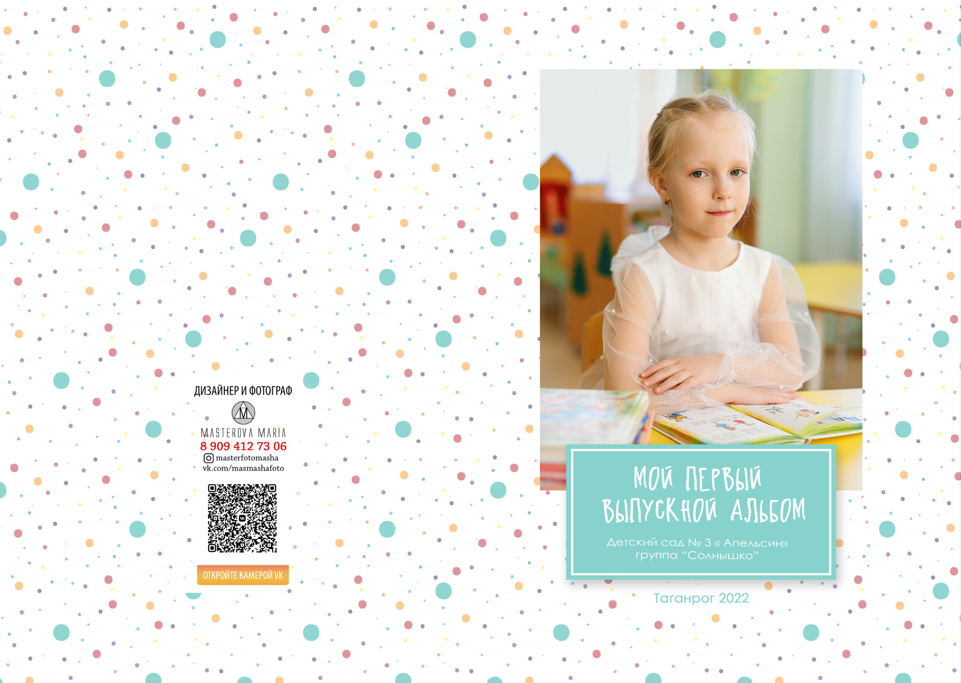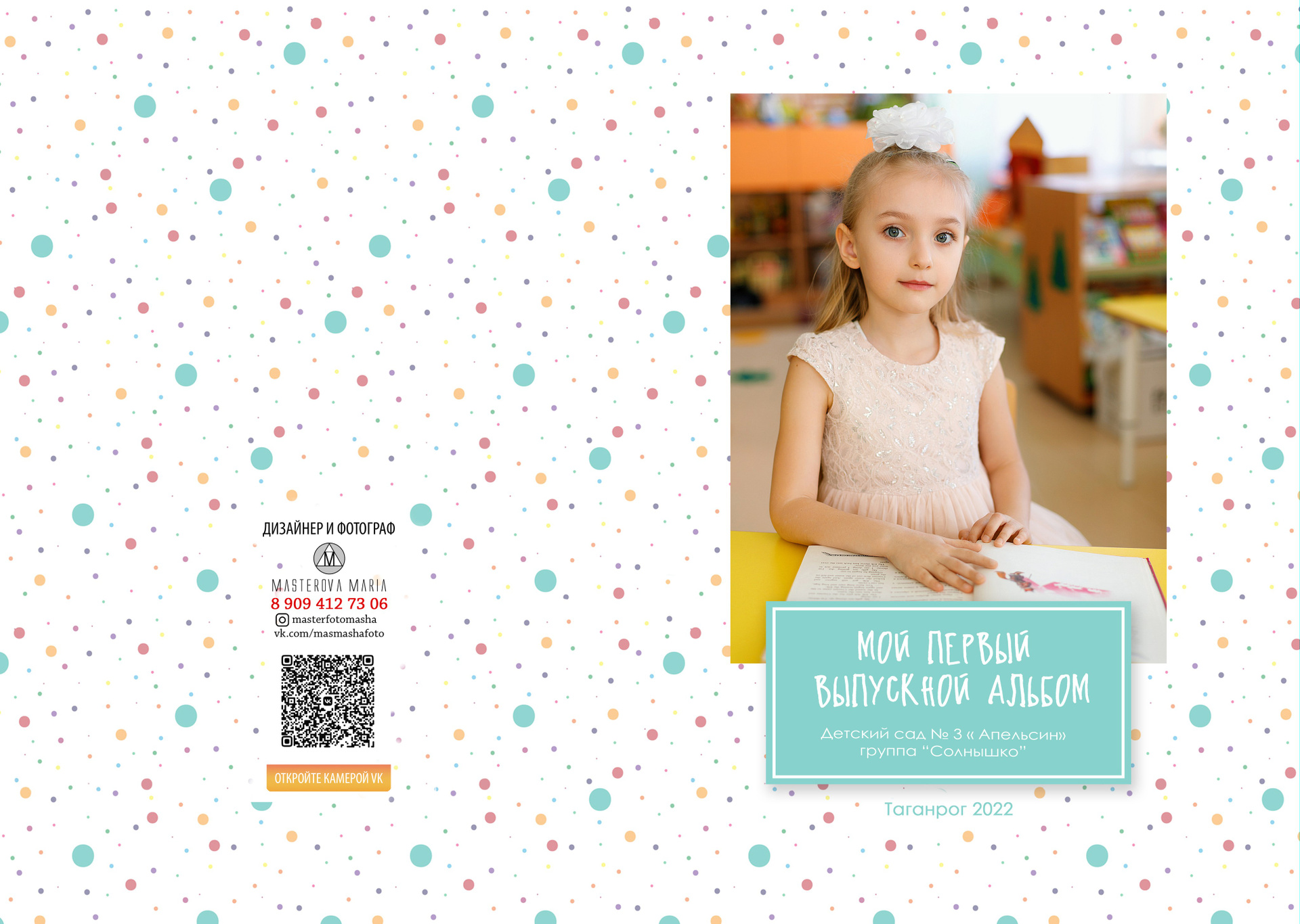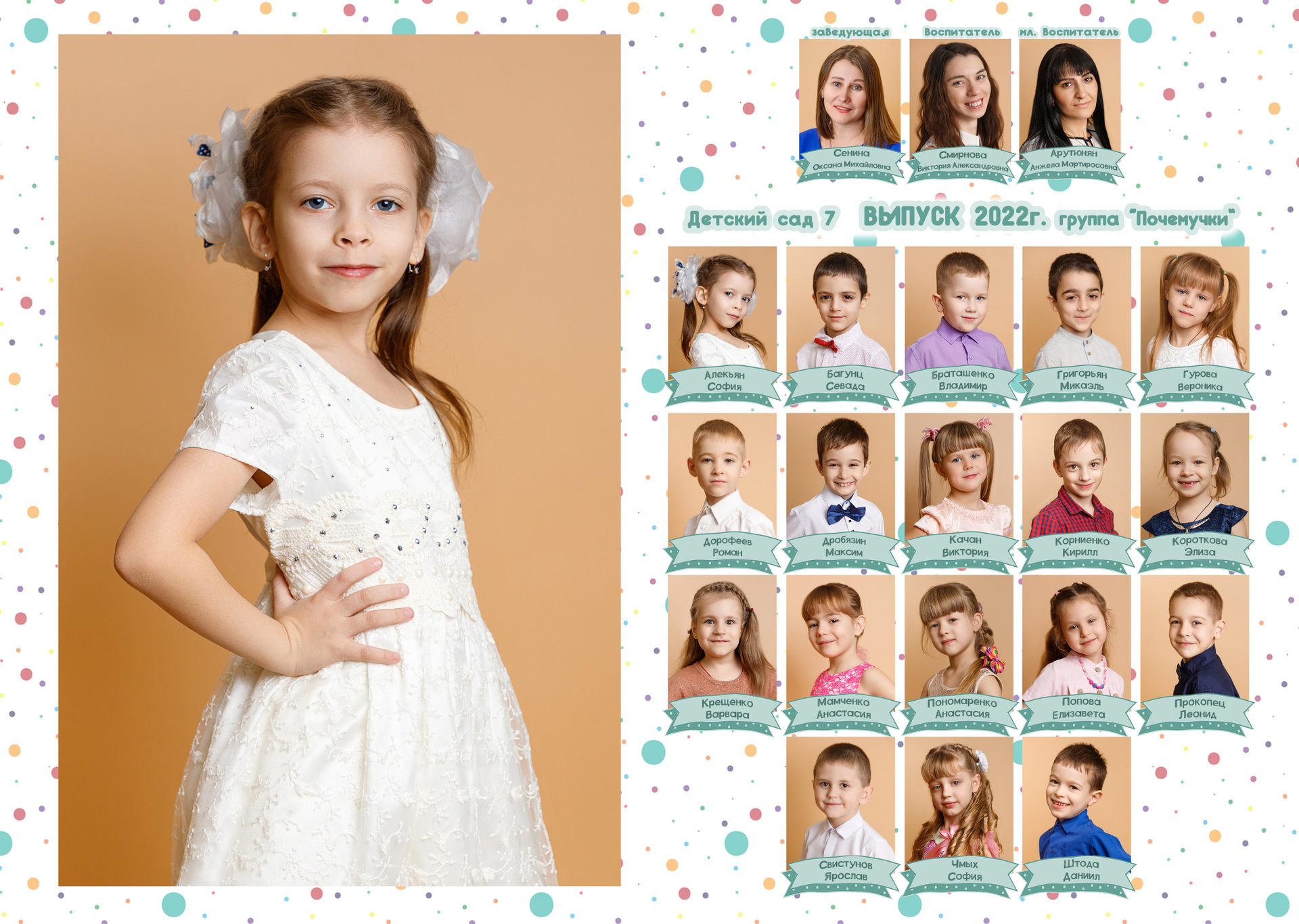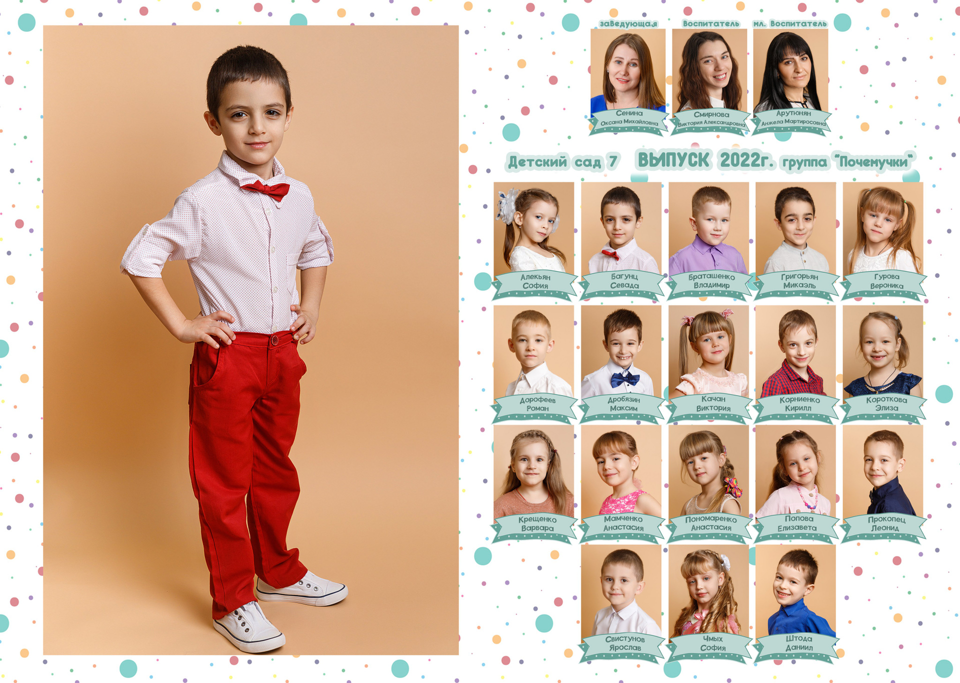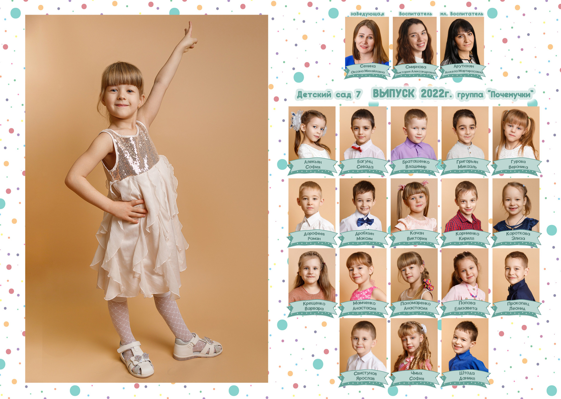 1 стр. — портрет№ 2. Можно в полный рост. Зависит от контекста съемки. В данном варианте портреты сняты в саду. Группа была маленькая, поэтому выбран объем «ЛАЙТ», где на первом развороте на 2 стр. расположены виньетки. У вас может быть по другому.
