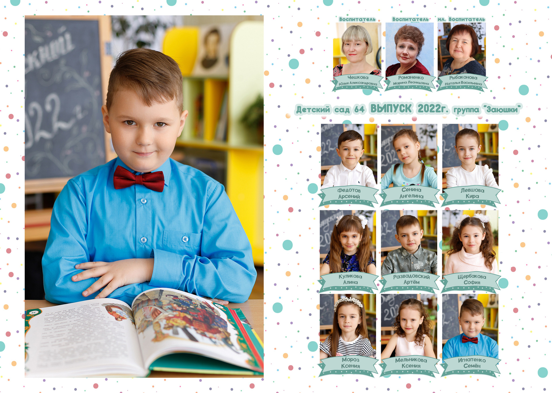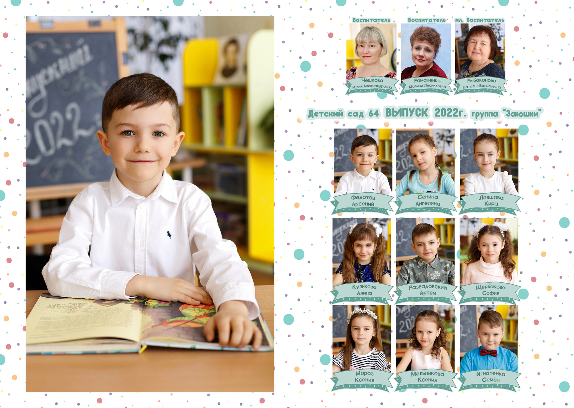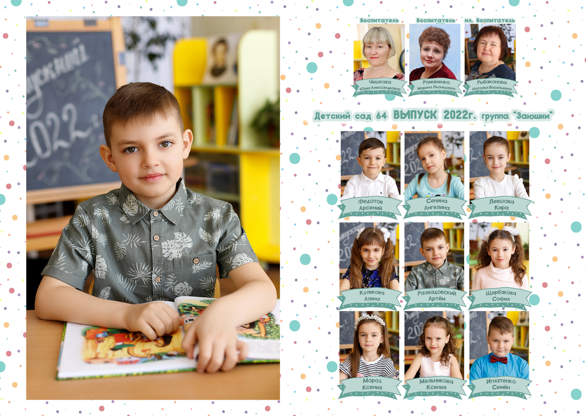 Неотъемлемый элемент альбома. В бюджетных вариантах у всех воспитанников одинаковый. Т.е. примерно из 7 фото ваш малыш будет на 3-4. Но можно выполнить индивидуальные развороты. Это прописывается в договоре. В составе альбома может быть несколько таких разворотов.