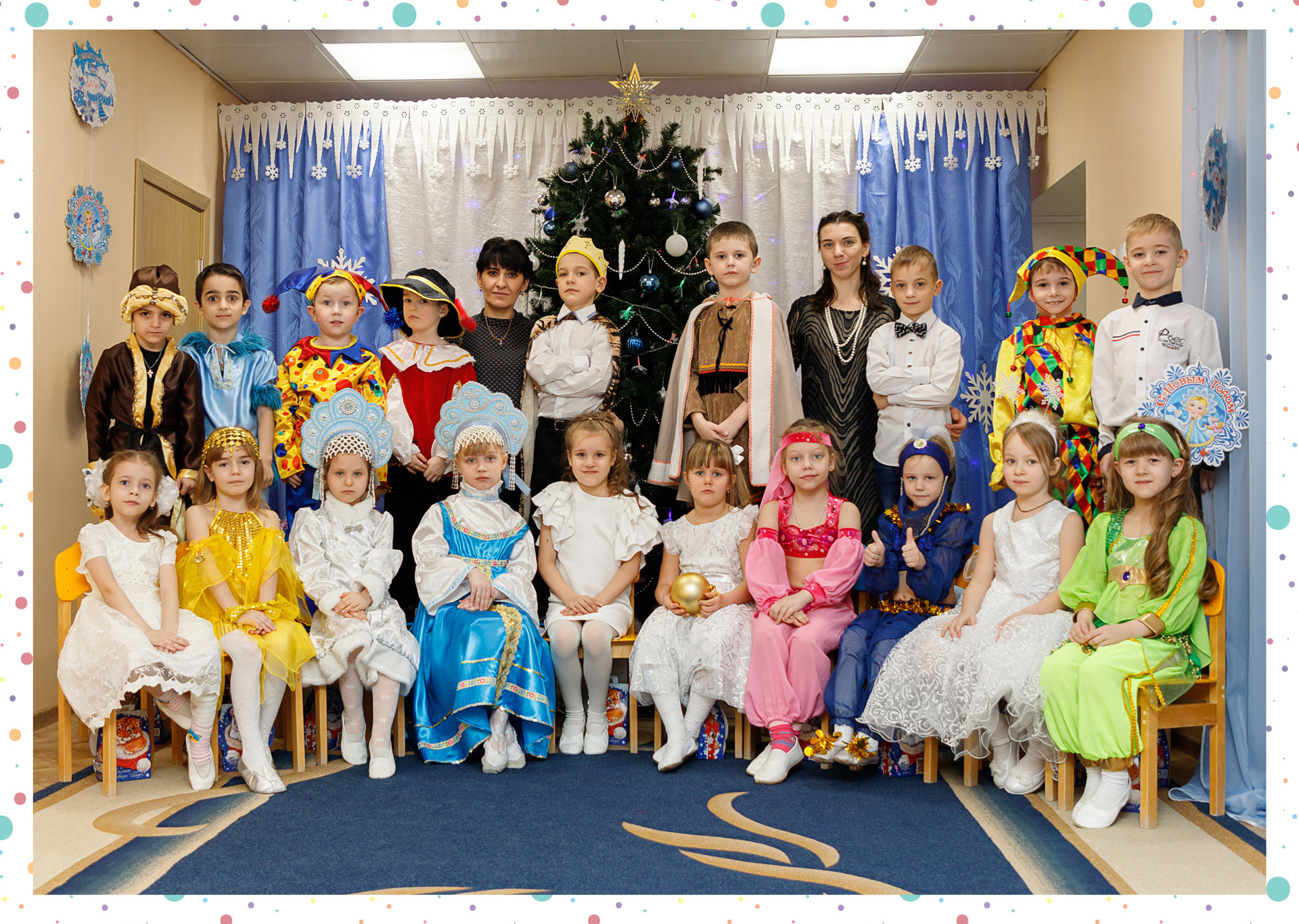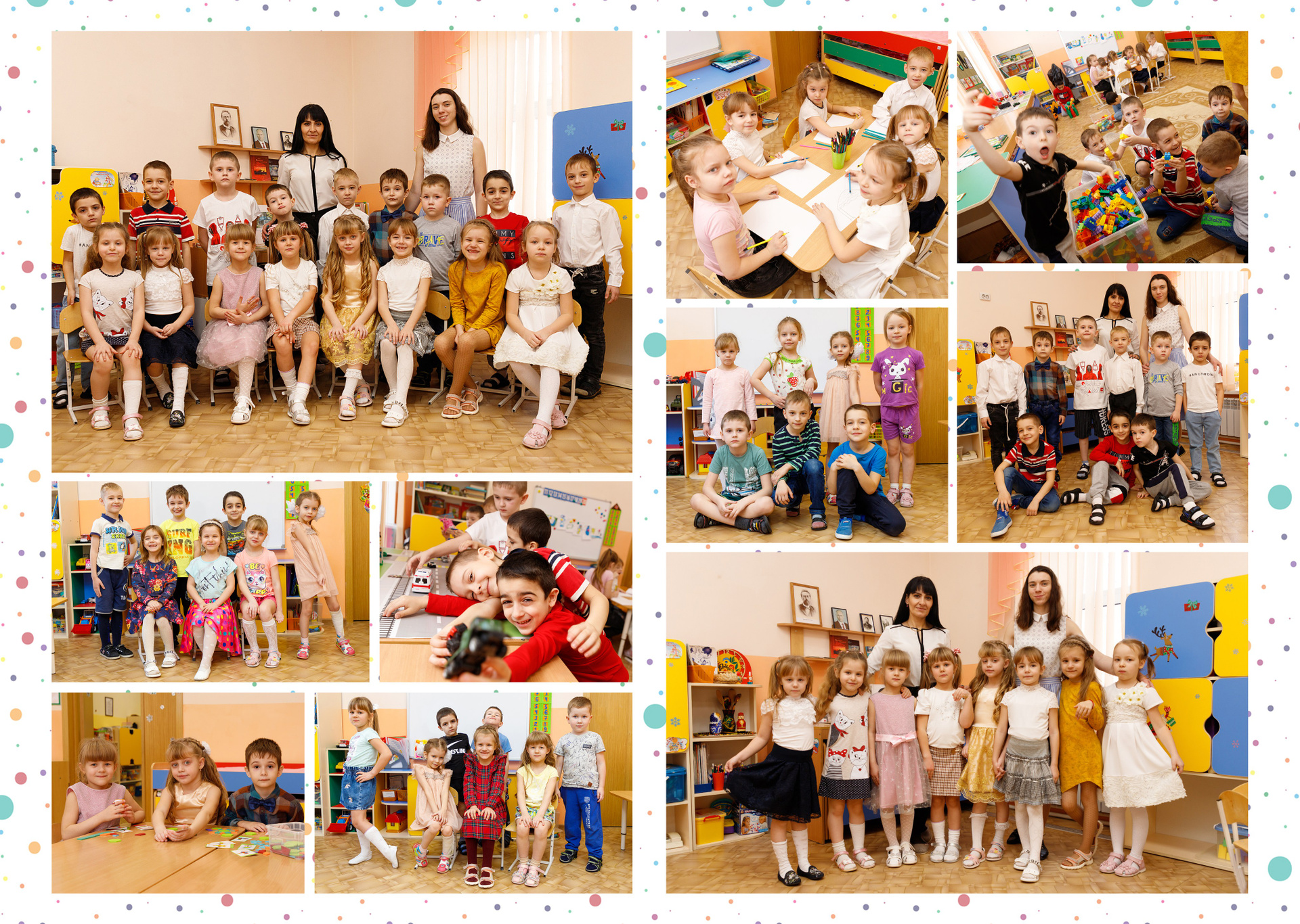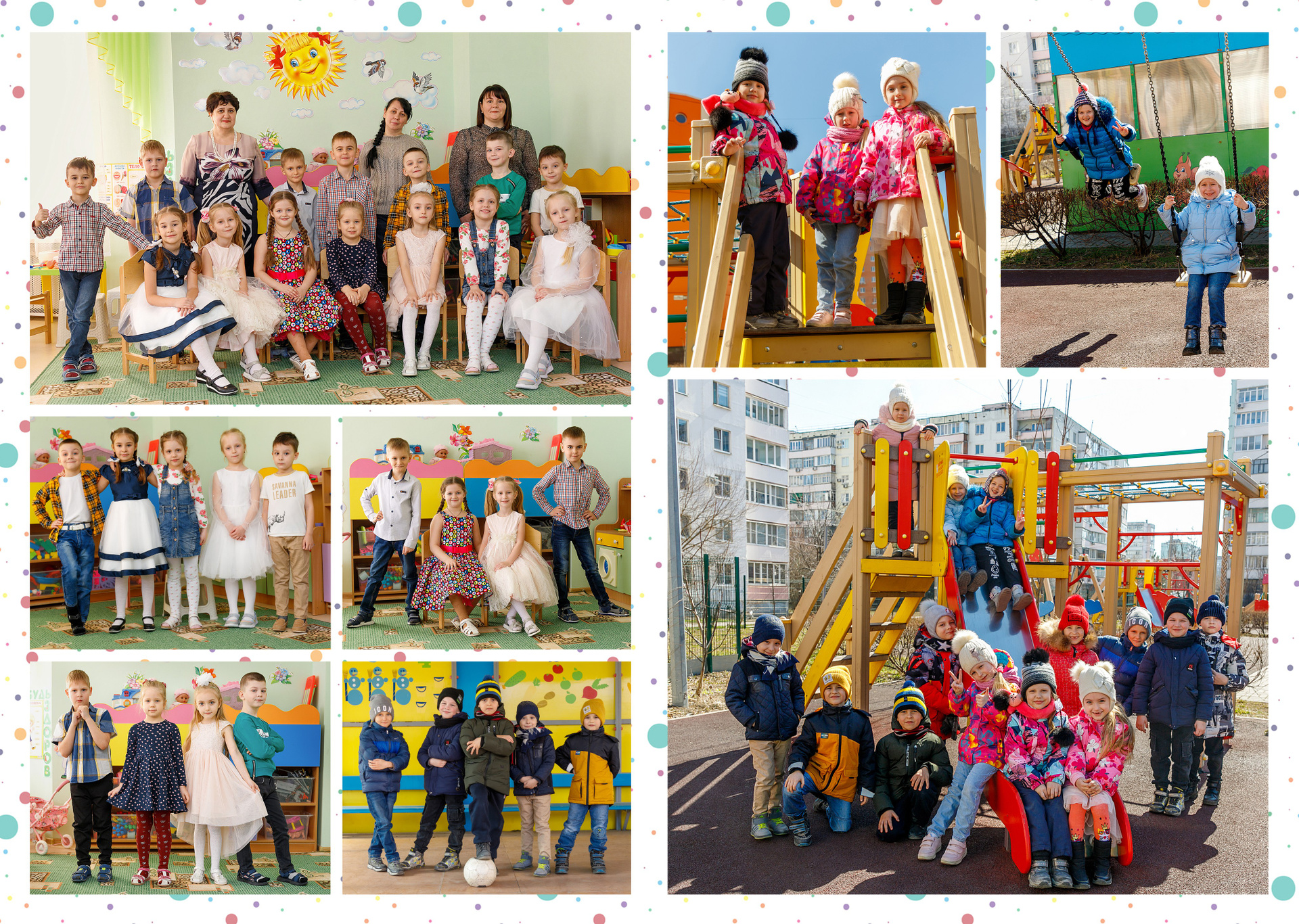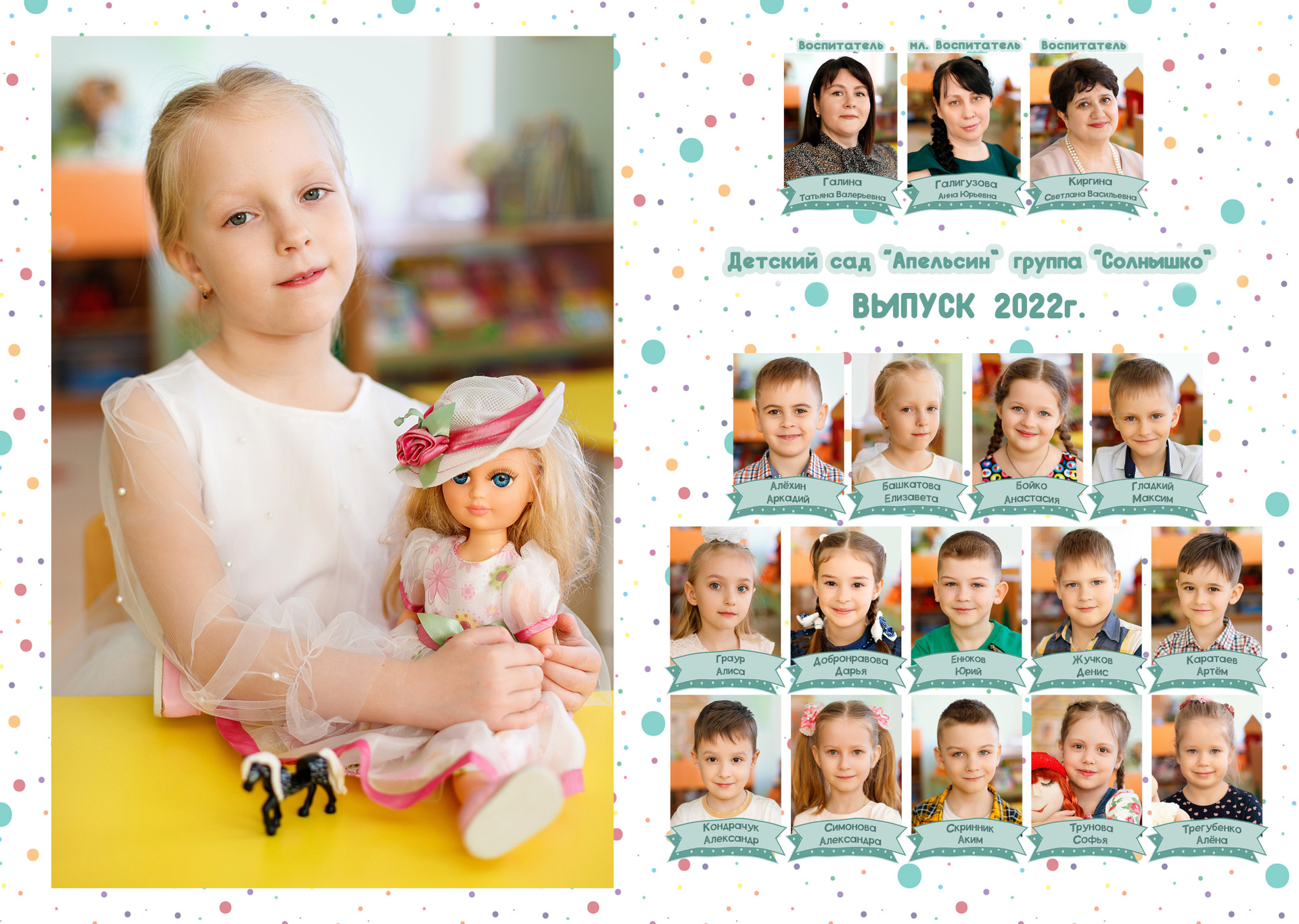Неотъемлемый элемент альбома. В бюджетных вариантах у всех воспитанников одинаковый. Т.е. примерно из 7 фото ваш малыш будет на 3-4. Но можно выполнить индивидуальные развороты. Это прописывается в договоре. В составе альбома может быть несколько таких разворотов.