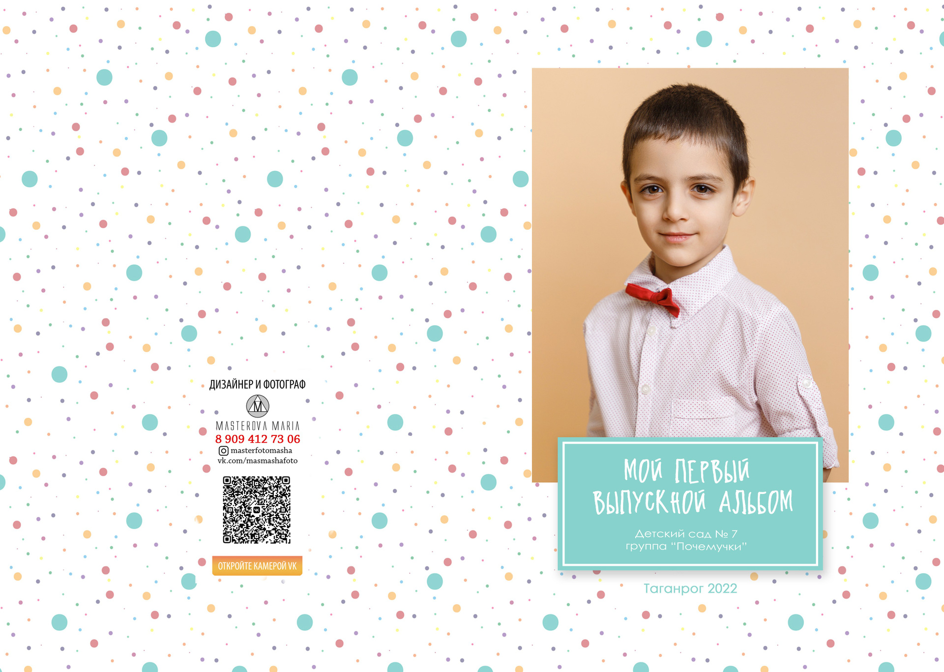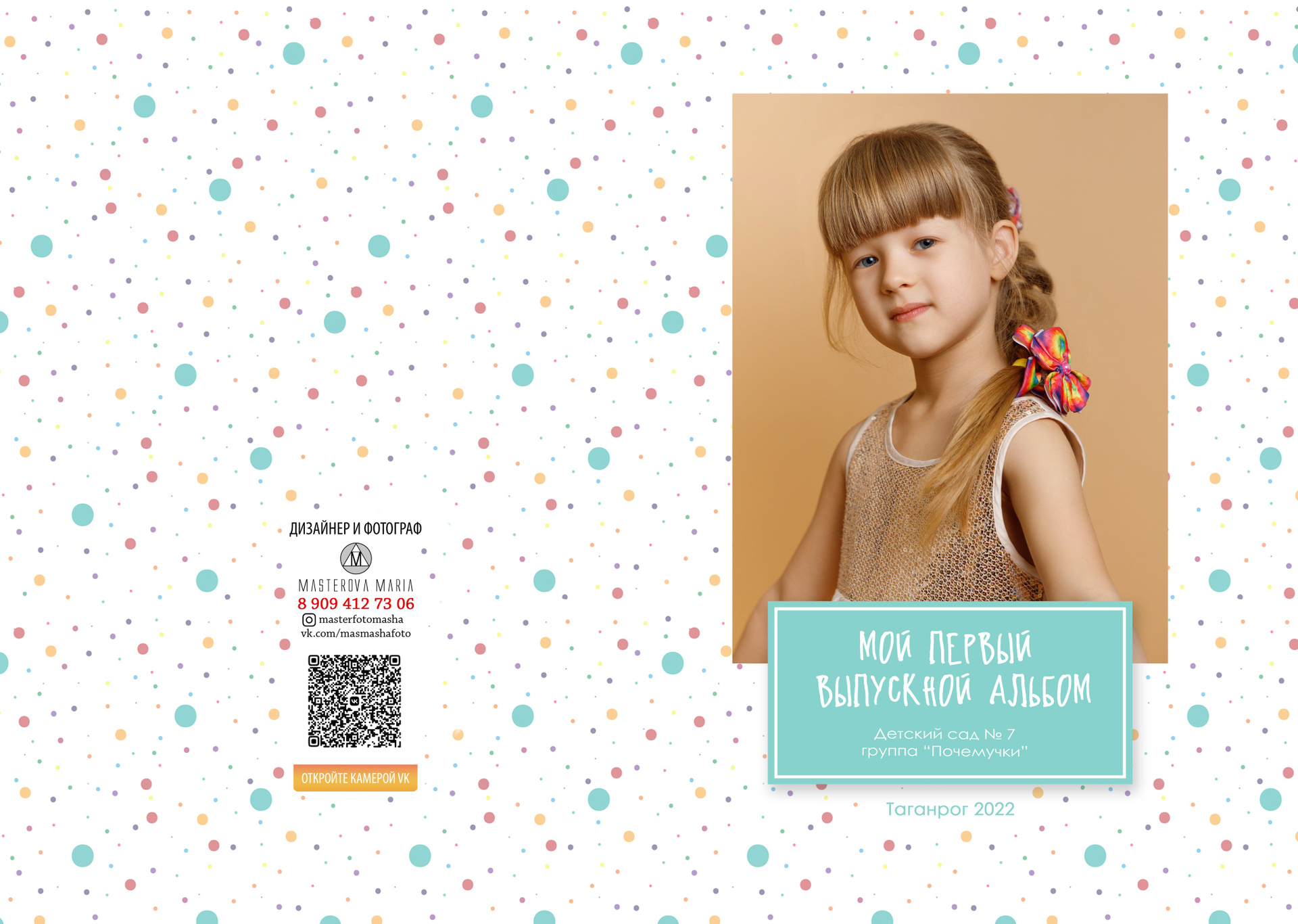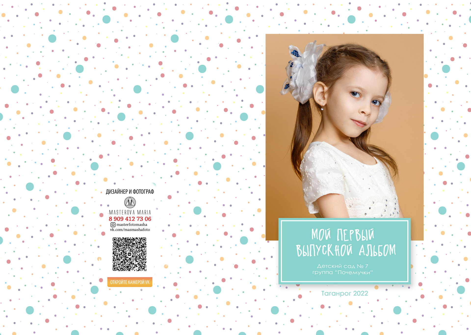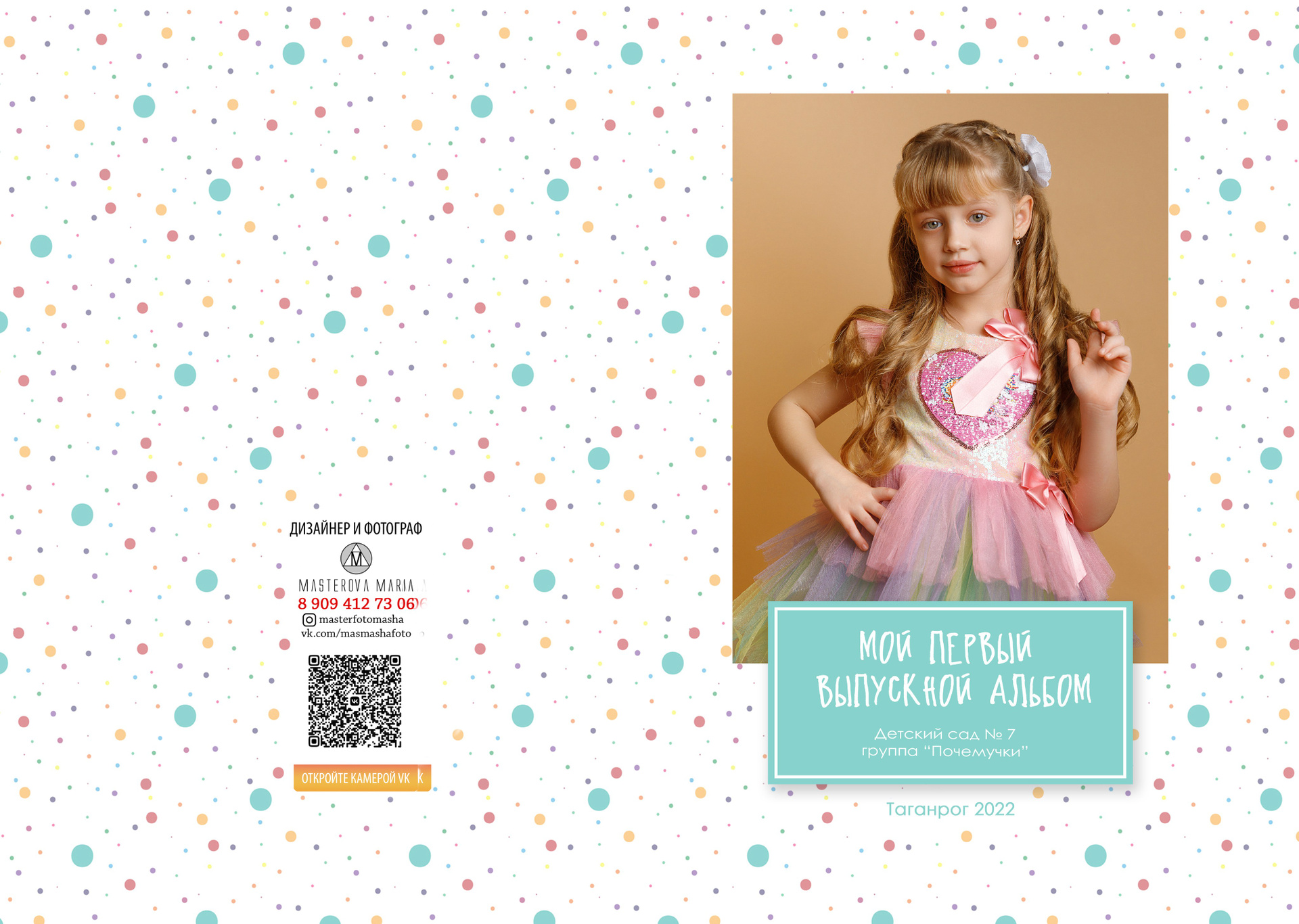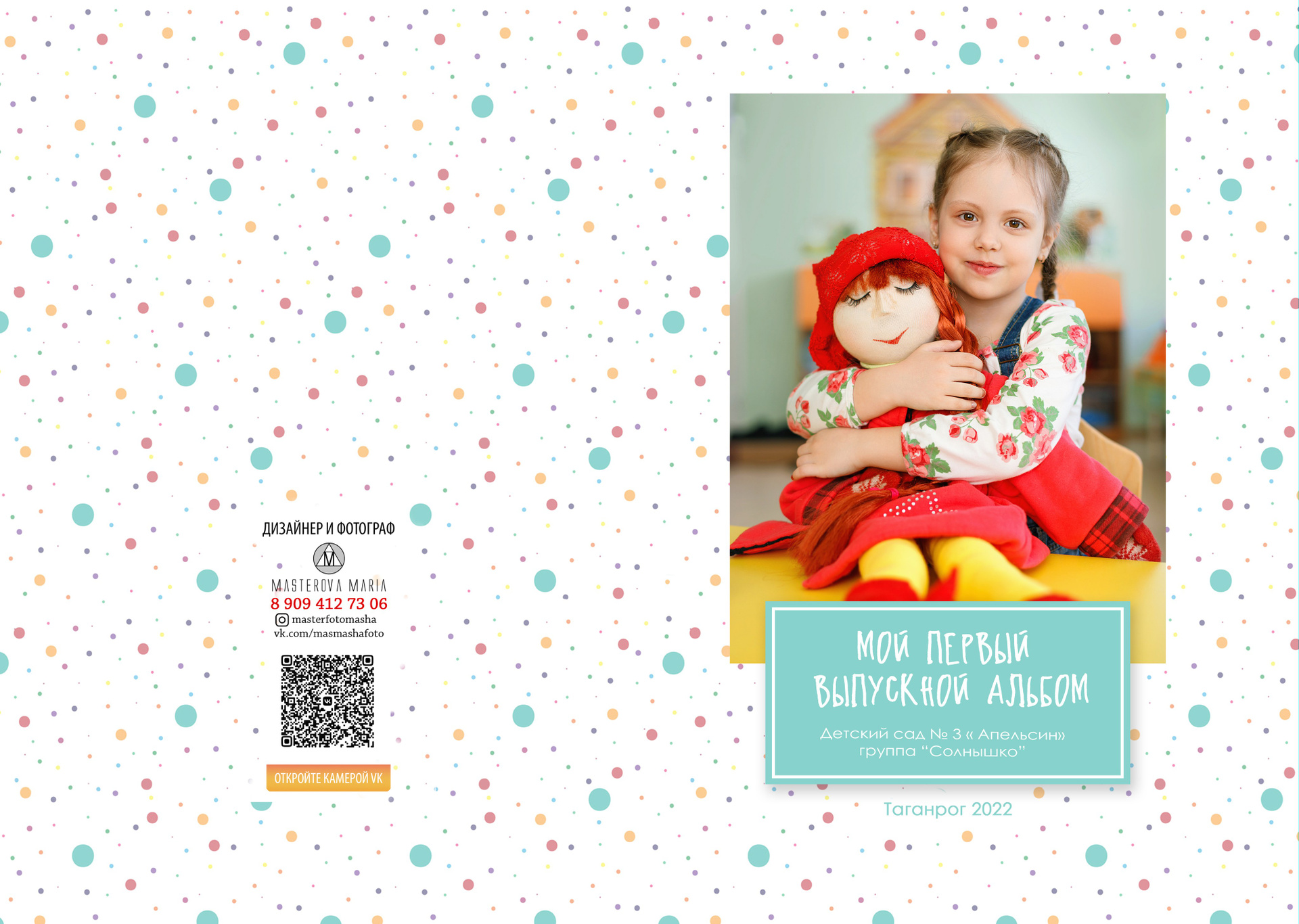 Твердая обложка, глянцевая ламинация. На передней части альбома портрет ребенка № 1 поясной или погрудный На задней части обложки может быть размещено общее фото.