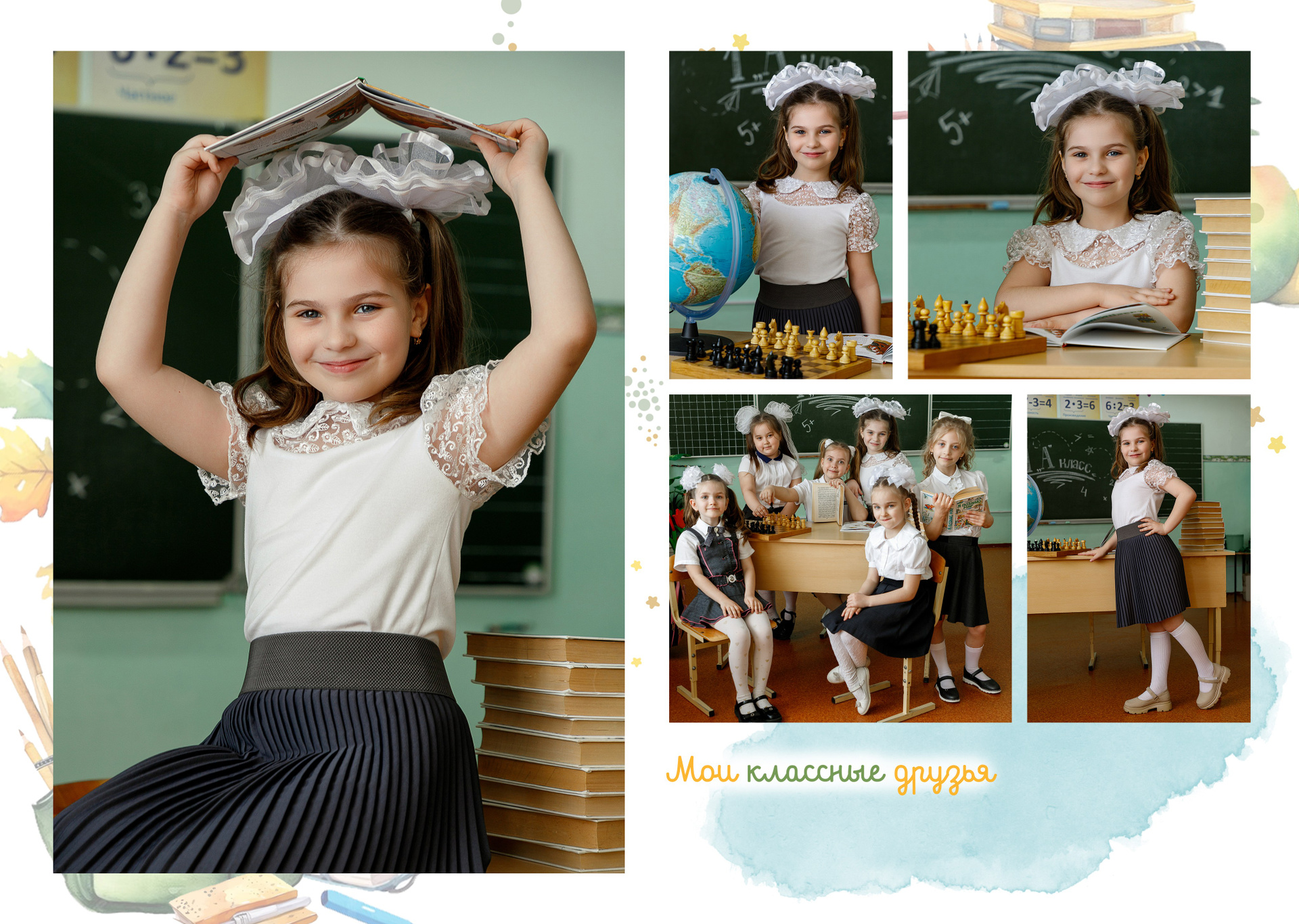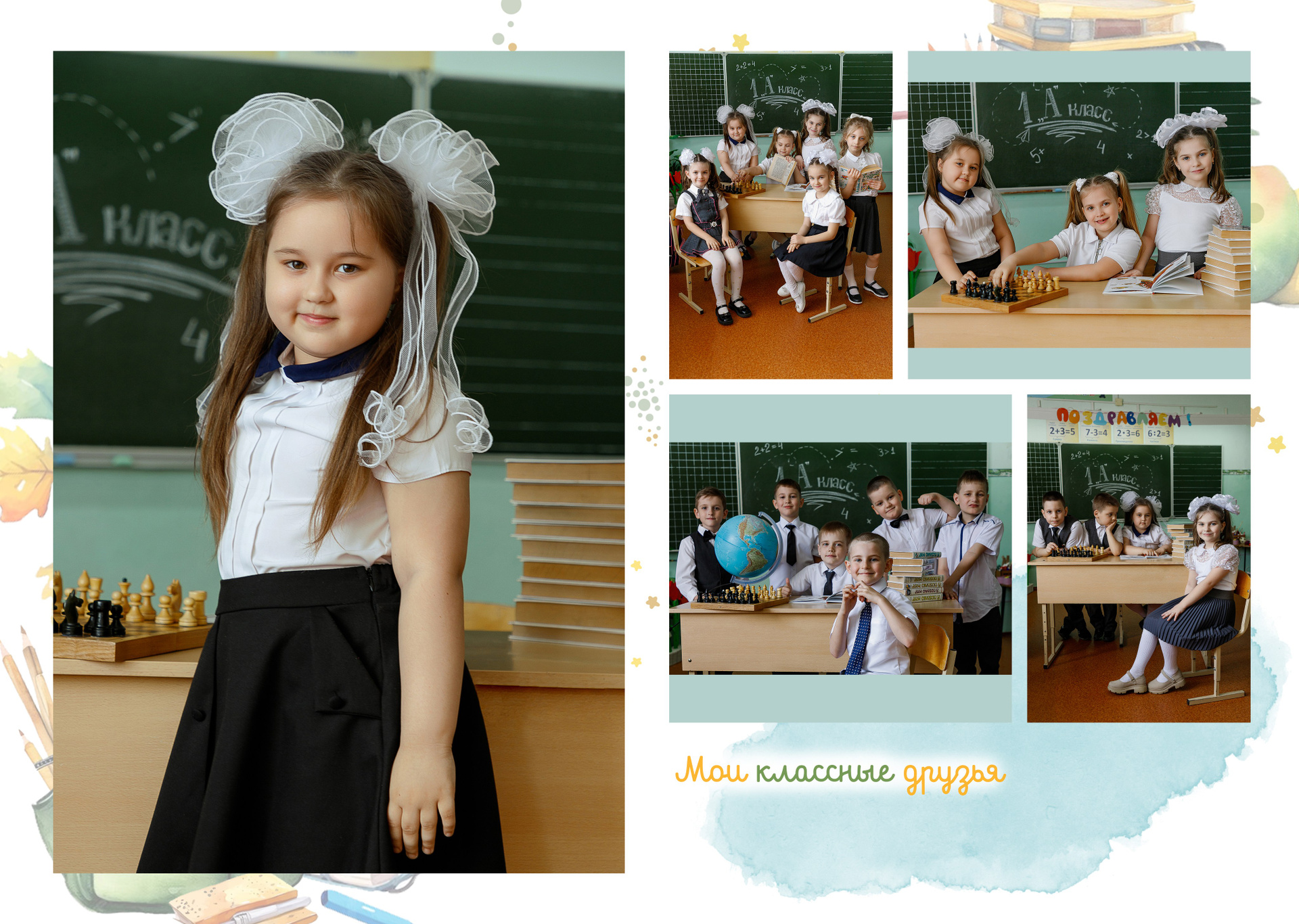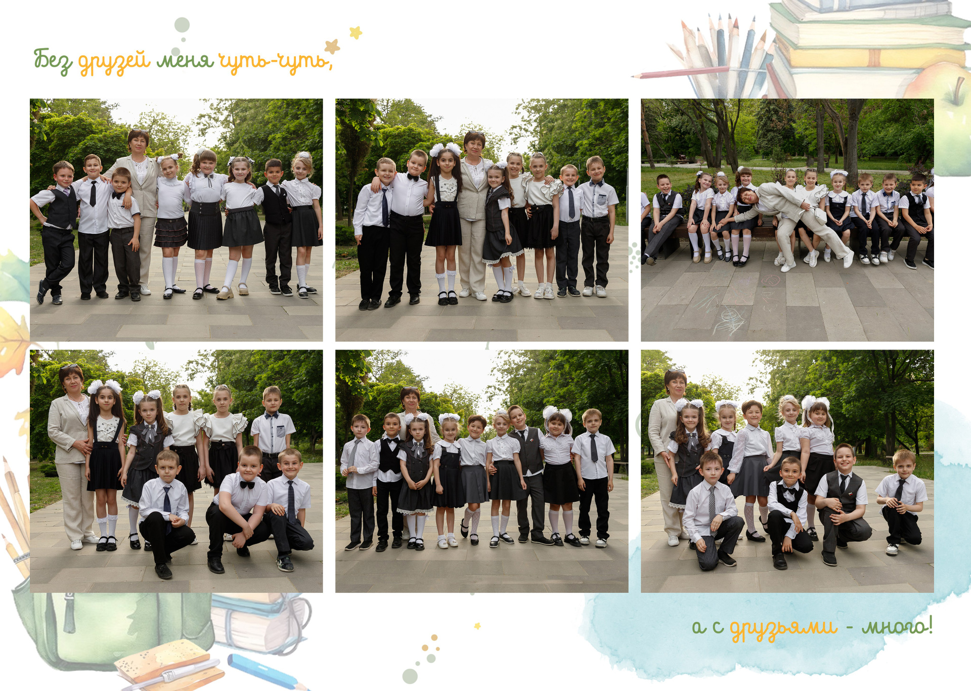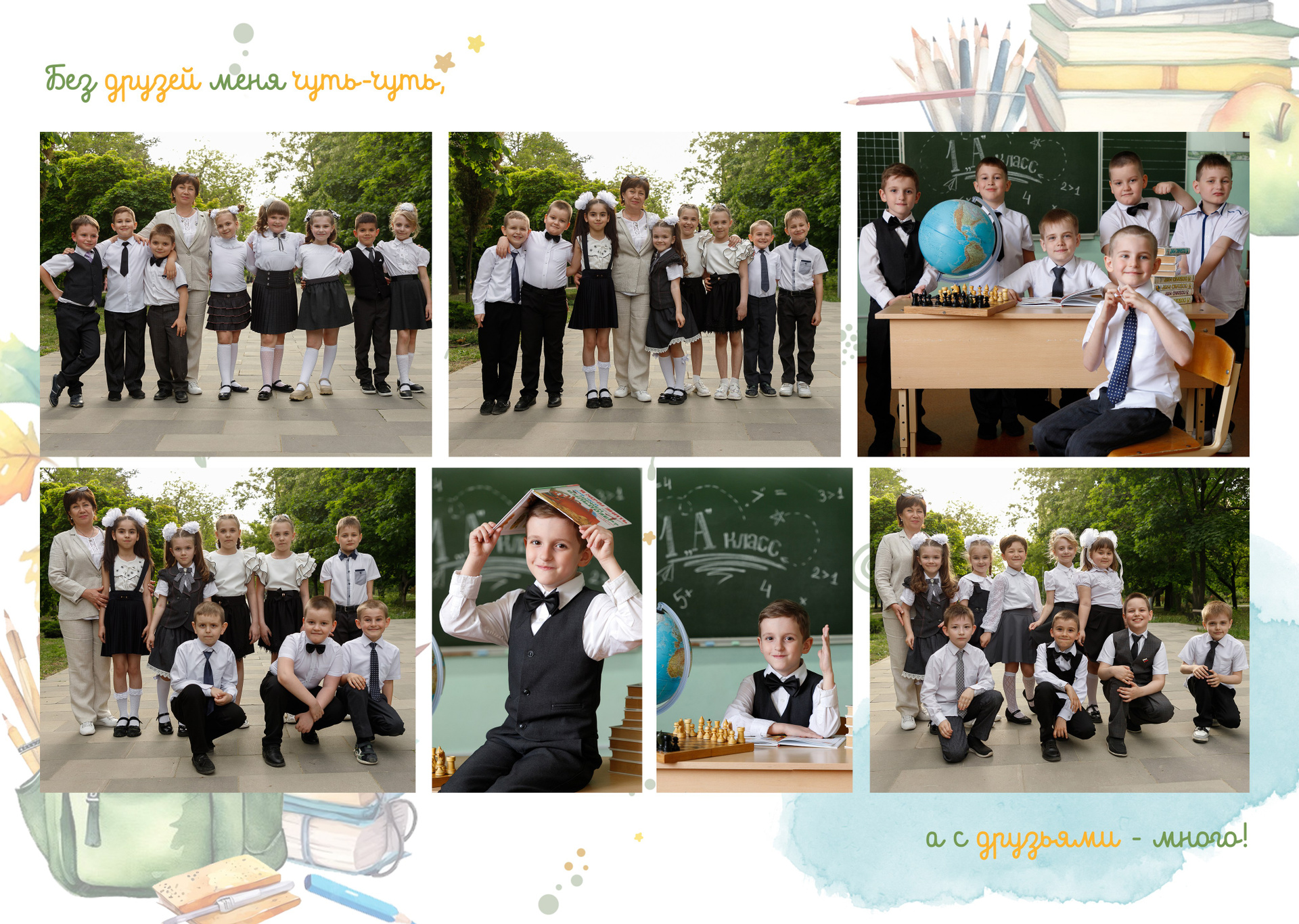Это важный информационный блок, где расположены дети и классный руководитель. Портрет на виньетку берем со 2 стр. первого разворота (Портрет № 2). Важно указывать полные имена деток и тщательно проверять перед печатью правильность написания ФИО.