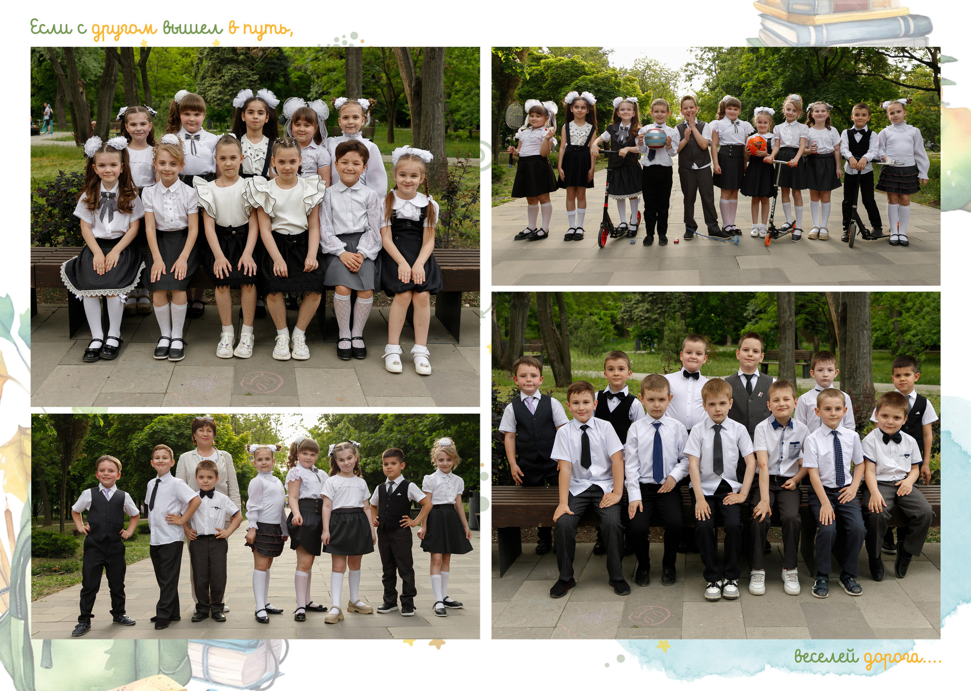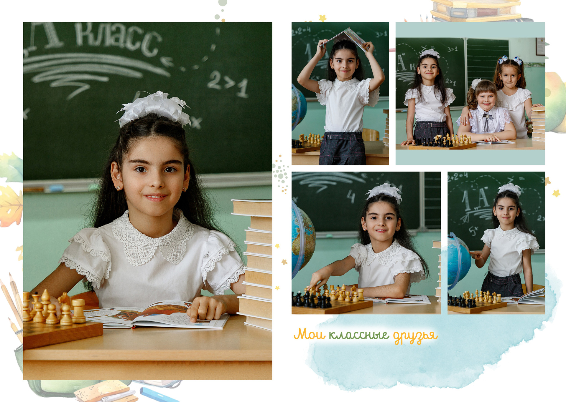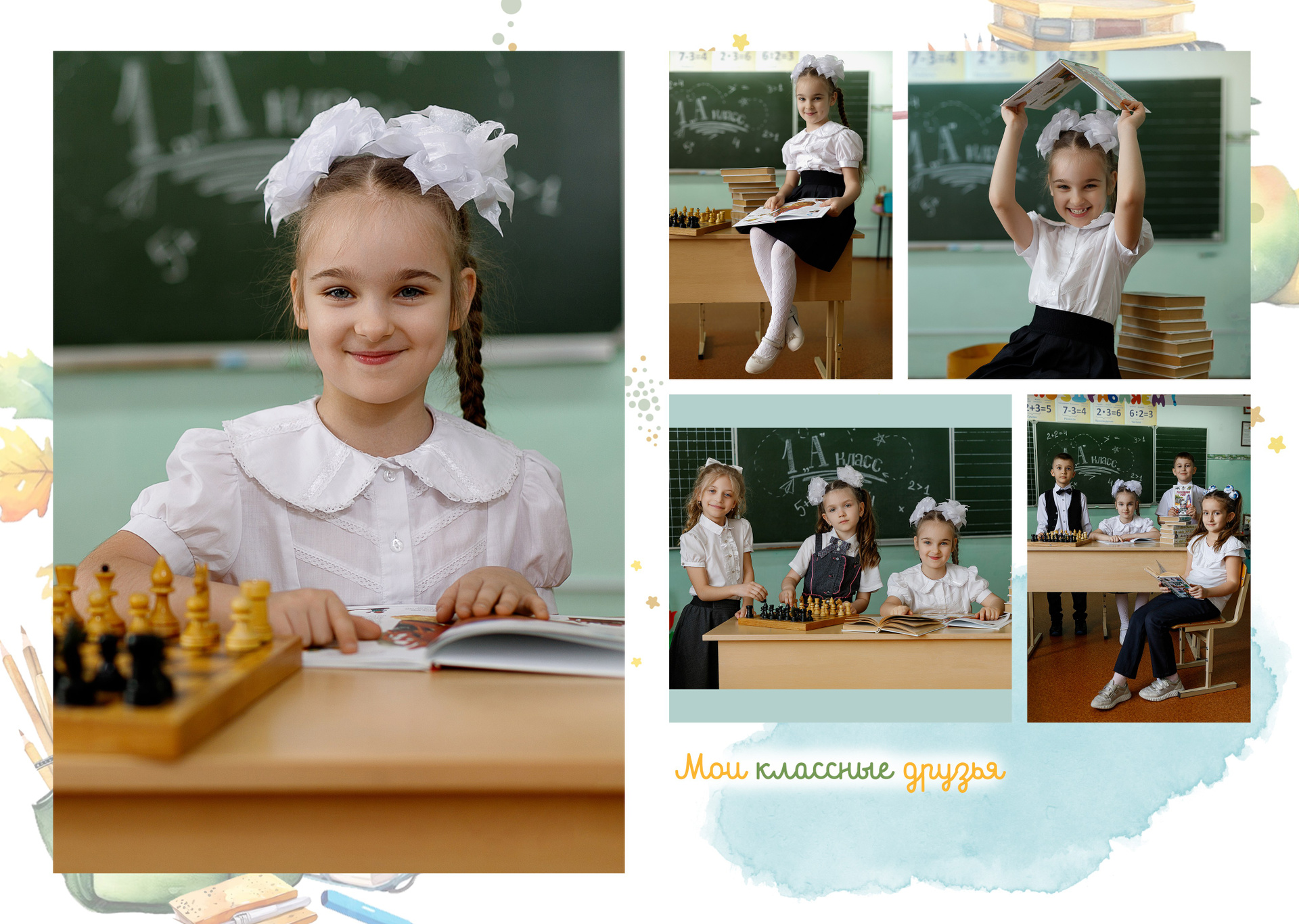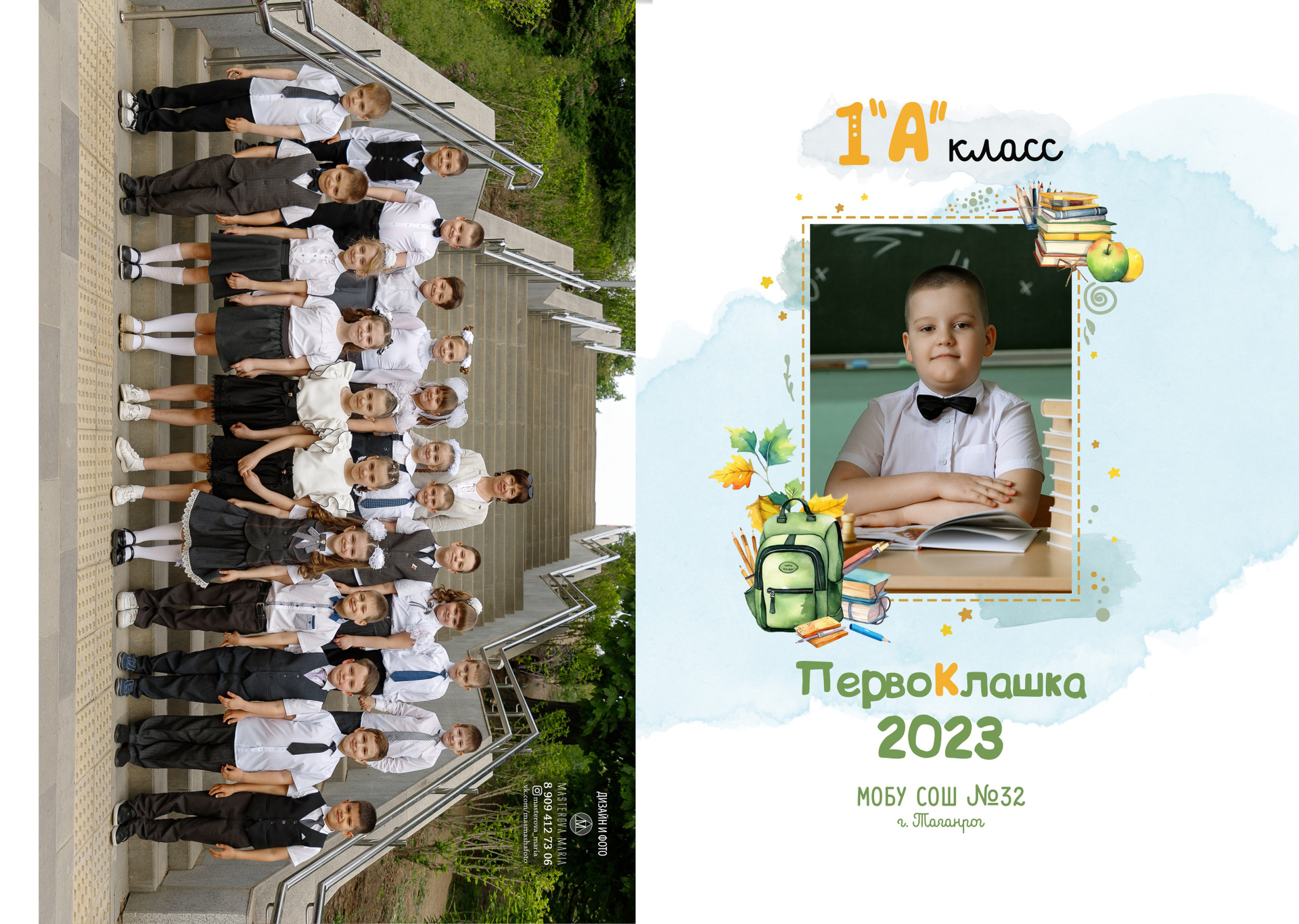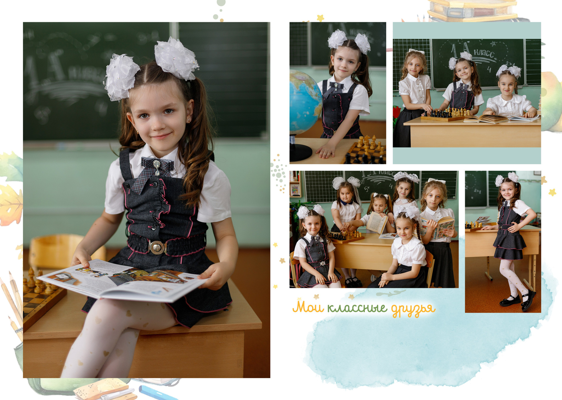 Это важный информационный блок, где расположены дети и классный руководитель. Портрет на виньетку берем со 2 стр. первого разворота (Портрет № 2). Важно указывать полные имена деток и тщательно проверять перед печатью правильность написания ФИО.
