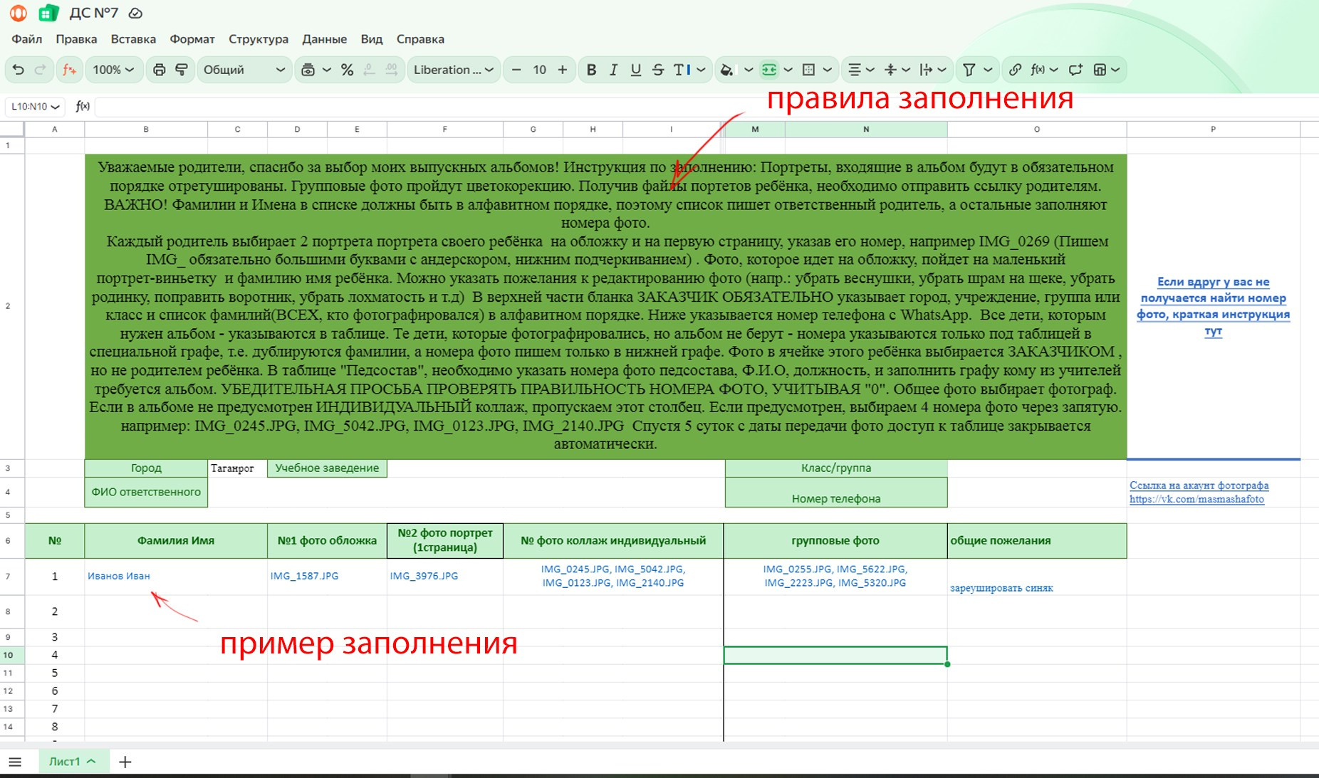 После отбора фото необходимо будет заполнить таблицу, в которой каждая колонка соответствует странице альбома. Внимательно вписываем номера фото. Все правила заполнения таблицы есть в самой таблице. Ссылка на таблицу каждого класса или группы индивидуальная, спросите у ответственного родителя. Свои данные заполняет каждый родитель сам. Таблицу заполнять в алфавитном порядке, Список учеников или воспитанников заполняет ответственный родитель.